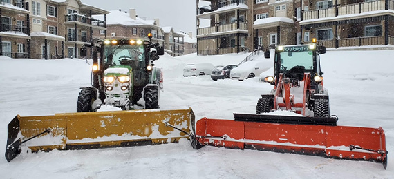 Notre équipement comprend plusieurs tracteurs récents avec gratte avant et souffleuse arrière tous deux munies de téflon* (spécialement conçu pour éviter les dommages aux entrées).